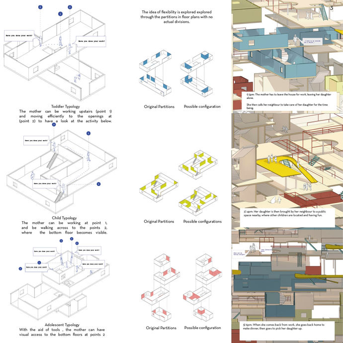 "A refreshingly original concept addressing ways of life and not extreme scenarios. The ideas are sophisticated and the response derived from serving the ideas and not superimposed forms. The superstructure is equally as conceptually supported as the units. A question that arises is the exlusive use of the superstructure by single mother households and what that segragation mean for the social environment. An adaptation of the typology to be more inclusive would benefit the proposal greatly."