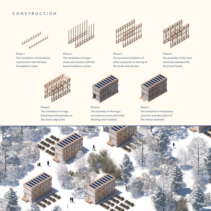 Overall a very interesting scheme and design articulation and intention are well presented. The design is convincing and it shows careful understanding of the context. However, the presentation didn't show clearly some critical details, like thermal insolation, fabrication of the construction elements/parts, which might leave questions to its audience.