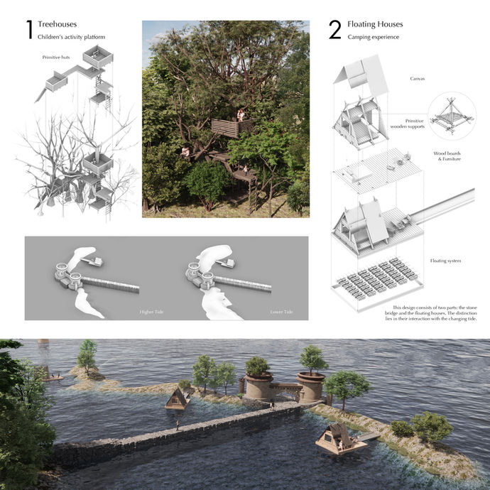 The project relies on simplicity and purity as ‘primitive huts’ in the landscape. Natural materials are used, and the structures have poetic qualities and are well integrated into the landscape. The proposal, however, remains as a series of fragments, and despite being well developed and drawn, the project as a whole has no clear overall conceptual narrative and no contemporary twists to offer an innovative solution.