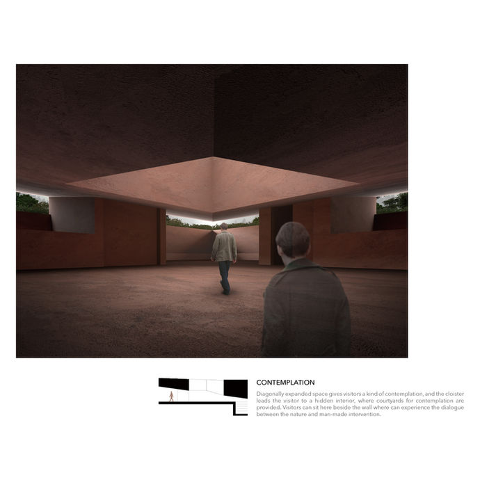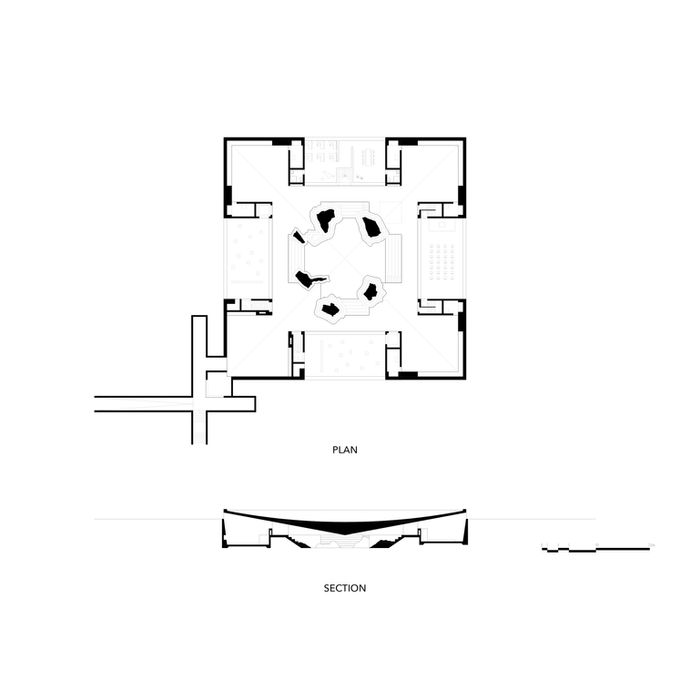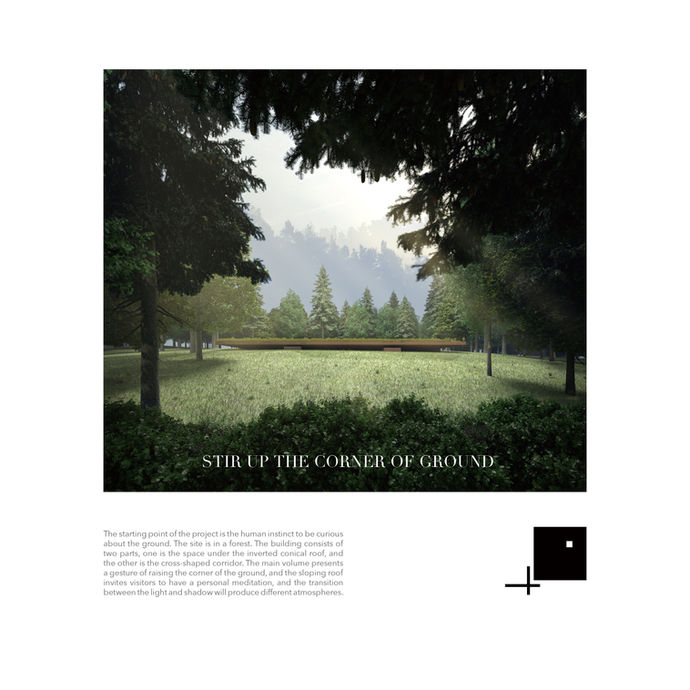 This is a strong, innovative project that ‘grounds’ the building in a clearing in the forest The massive inverted cone roof appears to hover gently over the ground, above a large sunken space with a rocky floor. The plan offers a range of well-scaled spaces from small to large with different atmospheres created by light, shadow, views, and compressed and expanded volumes. This vacillations between the natural and man-made are subtle and sophisticated, and demonstrated in carefully selected and crafted atmospheric sections.