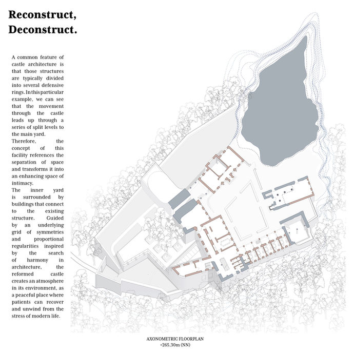Burnout and depression are addressed in this elegant, well developed, and beautifully drawn project. The site selection of a ruined castle is inspired in respect of a nurturing program within the shelter of the castle fortifications. The siting not only promotes sustainable reuse, but also embraces nature within the crumbling architecture which the author has capitalised on with the contrast between old and new construction and interior and exterior spaces. The ambiance is intimate, protected and nurturing as demonstrated in thoughtful interior renders.