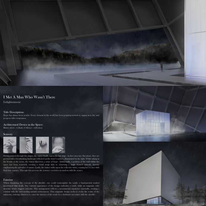 This entry appears to have understood the brief well and designed accordingly; allowing the sensorial experience of the spatial dimensions mirror the human journey. Very interesting concept and form development. Thought provoking and appropriate. I thoroughly enjoyed reviewing this entry.