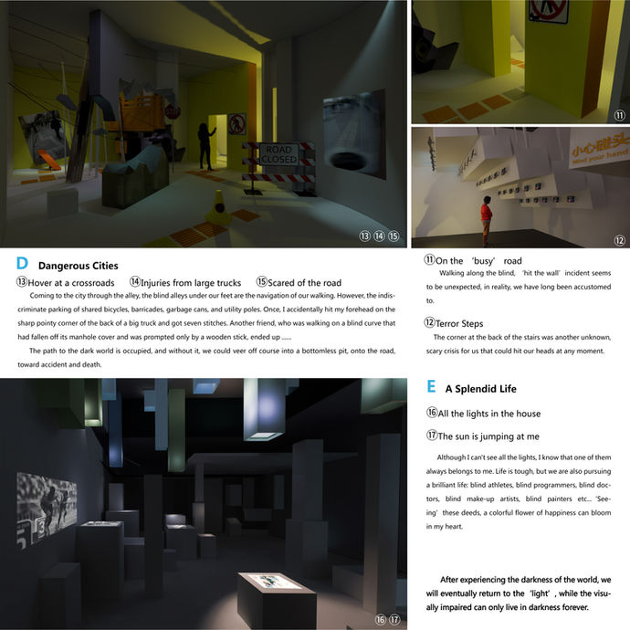 The design demonstrates a strong commitment to creating empathy and sensory engagement for sighted visitors by simulating the perspective of blindness. The emphasis on touch, sound, smell, and taste to compensate for the lack of visual input is commendable. The use of spatial experiential design to construct a sensory experience of blindness is a thoughtful approach, fostering a deeper understanding of the daily life and challenges faced by the visually impaired. The innovative aspects of the design lie in its use of a steel truss structure, which allows for a column-free layout, providing a high degree of freedom in the exhibition hall's design. The incorporation of a 6.8m floor height and the absence of natural light contribute to the uniqueness of the design concept.